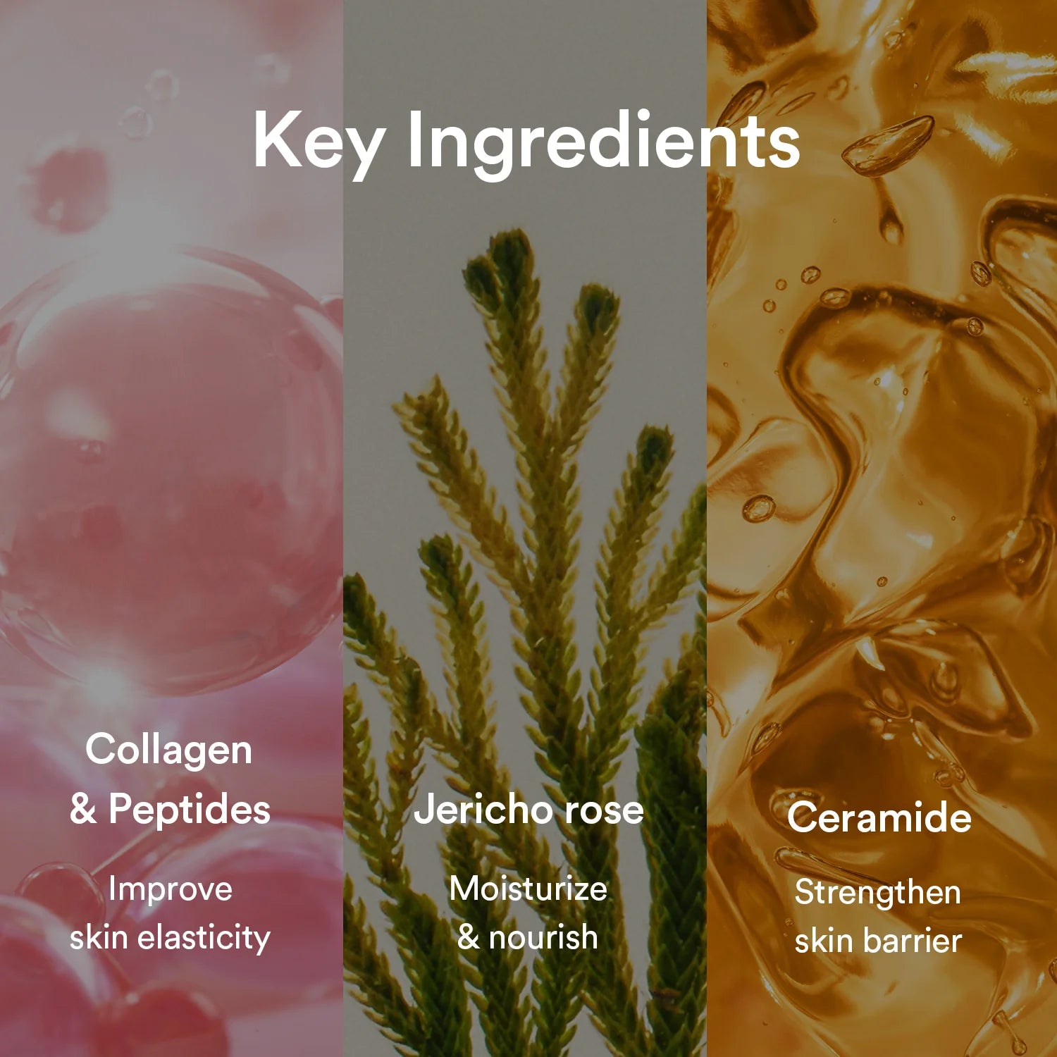 Intensyviai drėkinanti ir odą atgaivinanti gelinė lakštinė kaukė, sukurta sausai, elastingumą praradusiai ir sudirgusiai odai. Formulėje derinami augalinės kilmės kolagenas, Jericho rožės ekstraktas, hialurono rūgštis, keramidai ir pantenolis, kurie padeda atkurti odos drėgmės balansą, sustiprinti apsauginį barjerą ir sumažinti raukšleles. Švelnios hidrogelio tekstūros kaukė puikiai priglunda prie odos, užtikrina greitą veikliųjų medžiagų įsisavinimą bei malonų vėsinantį pojūtį.