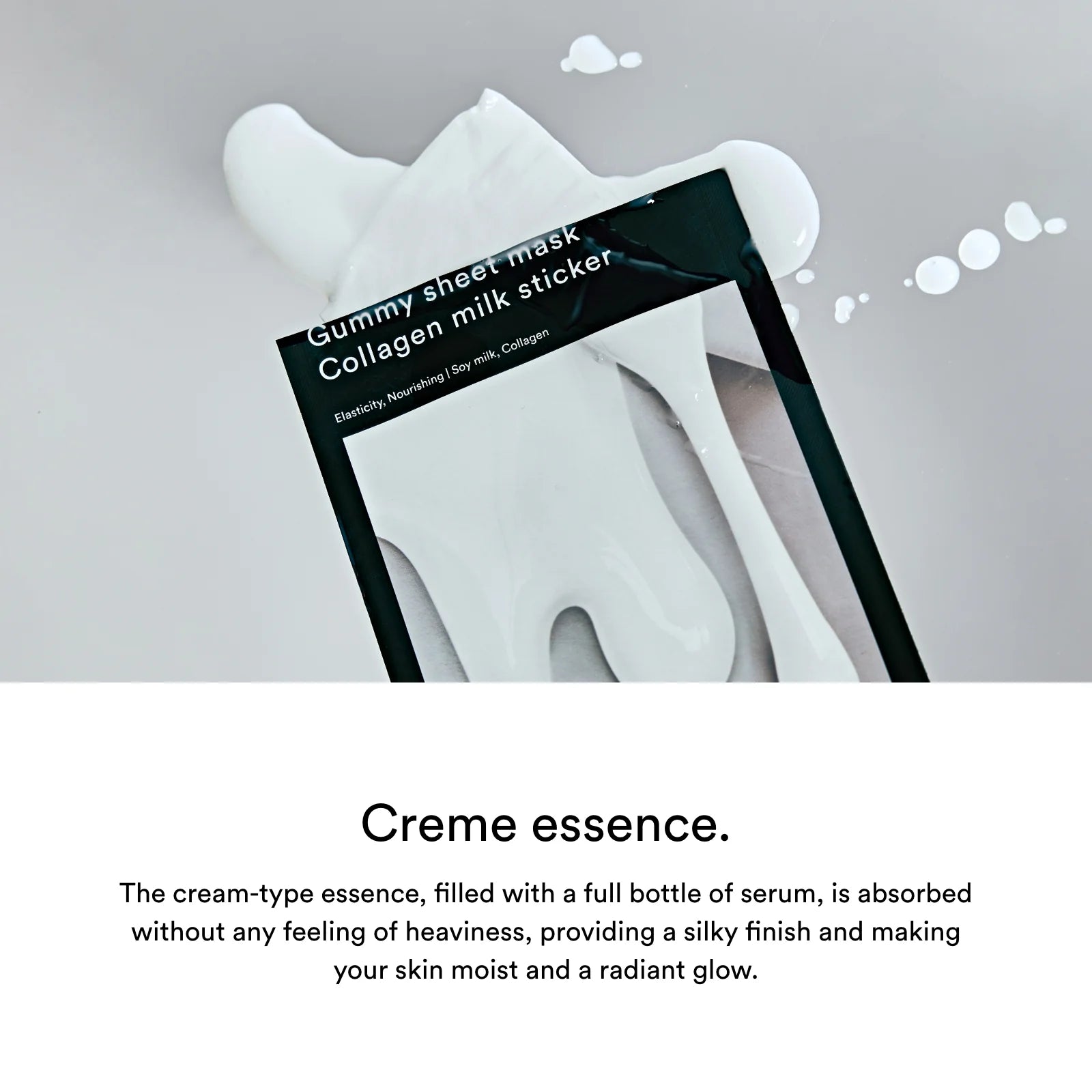 Šis itin gerai prie odos priglundantis mikrofibros lakštinis kaukės tipas sukurtas giliai maitinti, stangrinti ir drėkinti odą. Gummy Sheet Mask Collagen Milk Sticker kaukė praturtinta veganišku kolagenu, sojų pienu ir net devyniais peptidų kompleksais, kurie skatina odos elastingumą bei padeda sumažinti raukšleles. Kremine esencija prisotinta formulė suteikia odai švelnumo ir švytėjimo be sunkumo pojūčio.