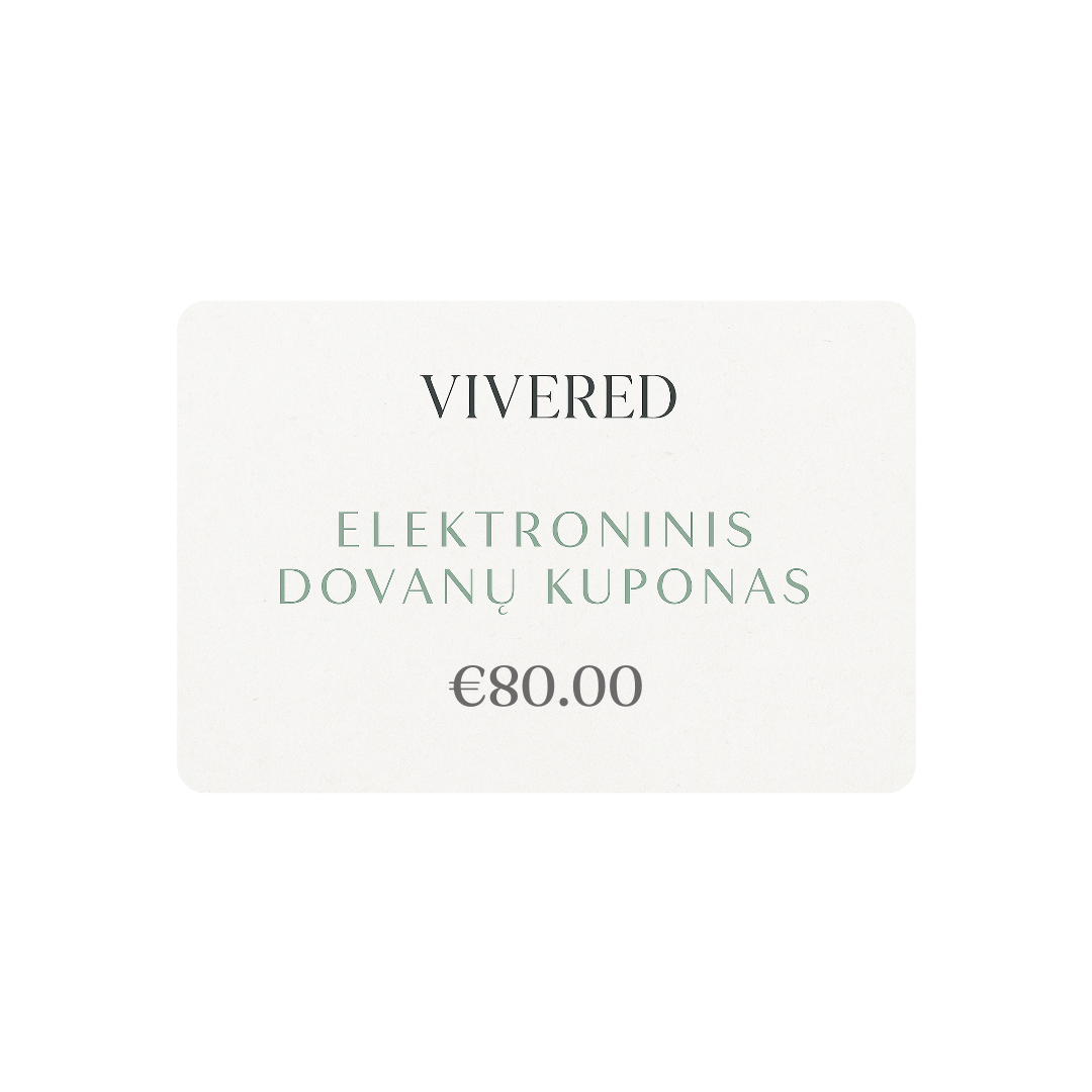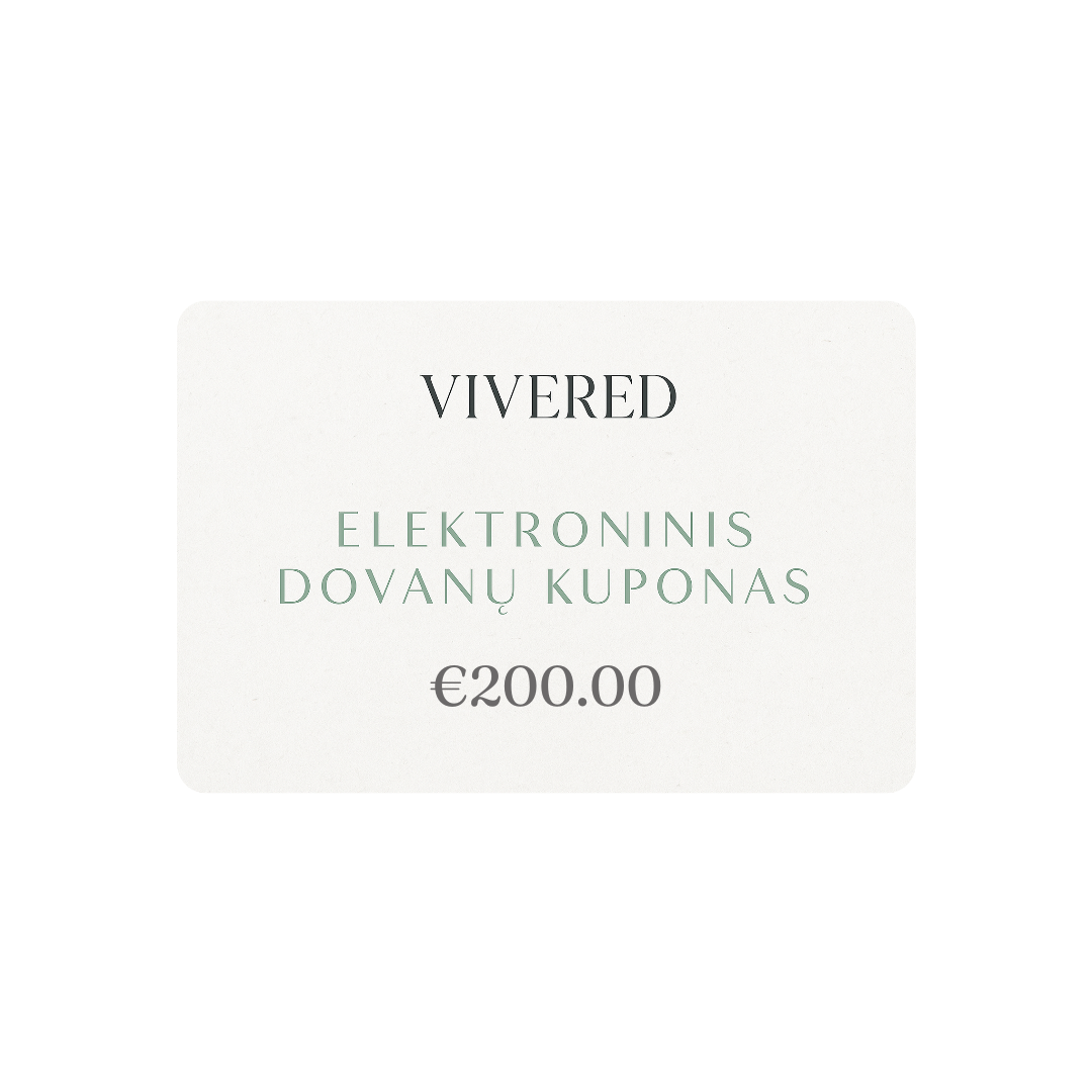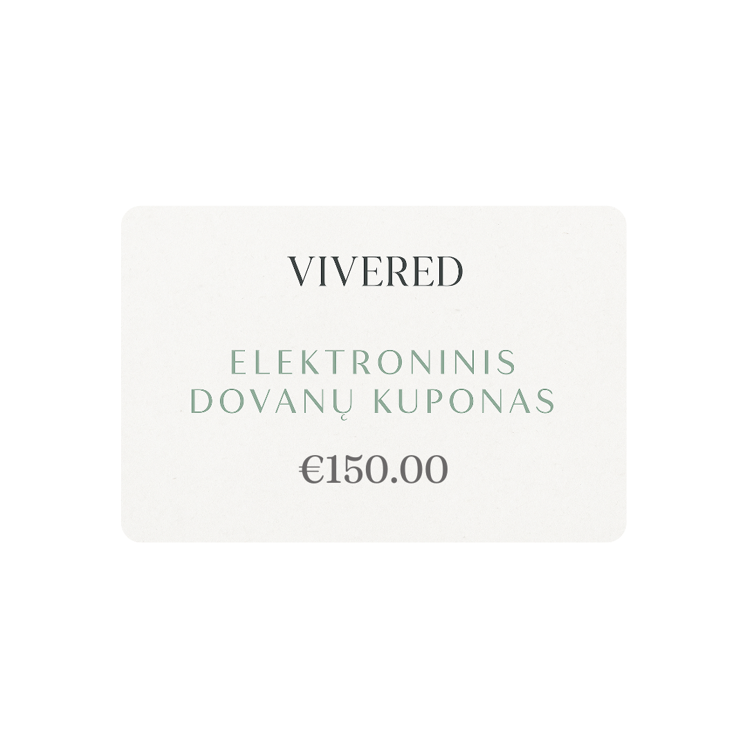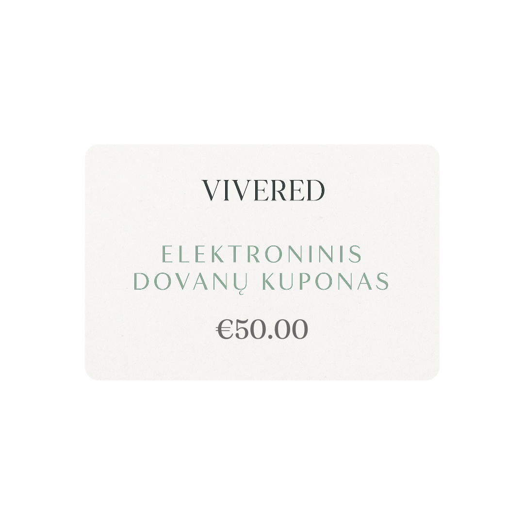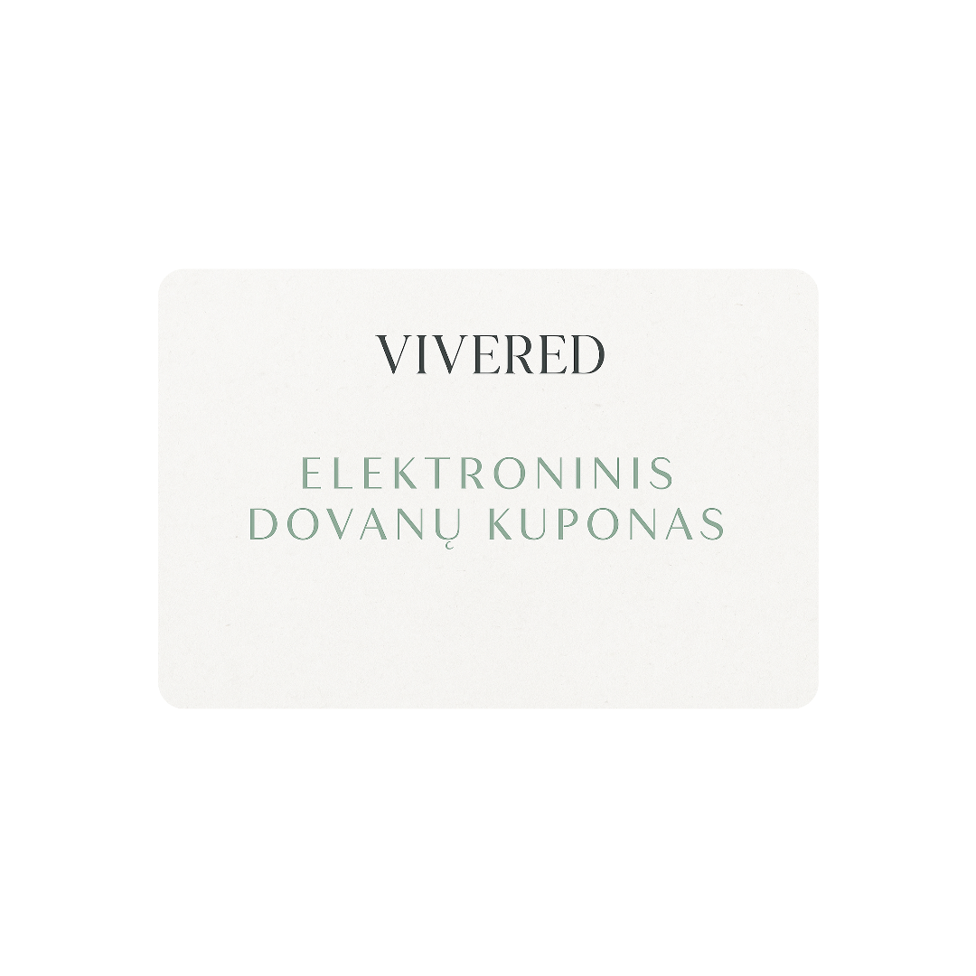 Šis dovanų kuponas galioja šešis mėnesius nuo įsigijimo dienos ir yra pritaikomas vieno apsipirkimo metu mūsų elektroninėje parduotuvėje www.vivered.lt. Kuponas nekeičiamas į pinigus ir nėra grąžinamas, taip pat jam netaikomos nuolaidos.